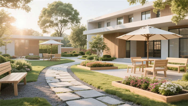 這套老年康養(yǎng)中心設(shè)計以現(xiàn)代簡約風格為核心,營造一個溫馨、安全且充滿活力的生活空間。設(shè)計強調(diào)自然光與柔和色彩的融合,入口大廳以開闊布局和藝術(shù)元素傳遞家的溫暖,休息區(qū)則通過舒適沙發(fā)和綠植打造社交港灣。餐廳和活動室注重功能性,淺色調(diào)家具與靈活布局鼓勵日?;?,促進社區(qū)歸屬感。居住單元采用圓角細節(jié)和私密氛圍,確保舒適休憩??祻?fù)訓(xùn)練區(qū)融入防滑設(shè)計和自然光,支持健康活動。戶外庭院成為心靈綠洲,石板步道與花壇提供寧靜放松。多功能廳則適應(yīng)多樣需求,增強空間活力。整體設(shè)計以適老化理念貫穿,避免繁雜裝飾,突出簡約美學(xué)與人性關(guān)懷,讓每位長者感受到尊重與陪伴,在簡約中體驗生活的美好。