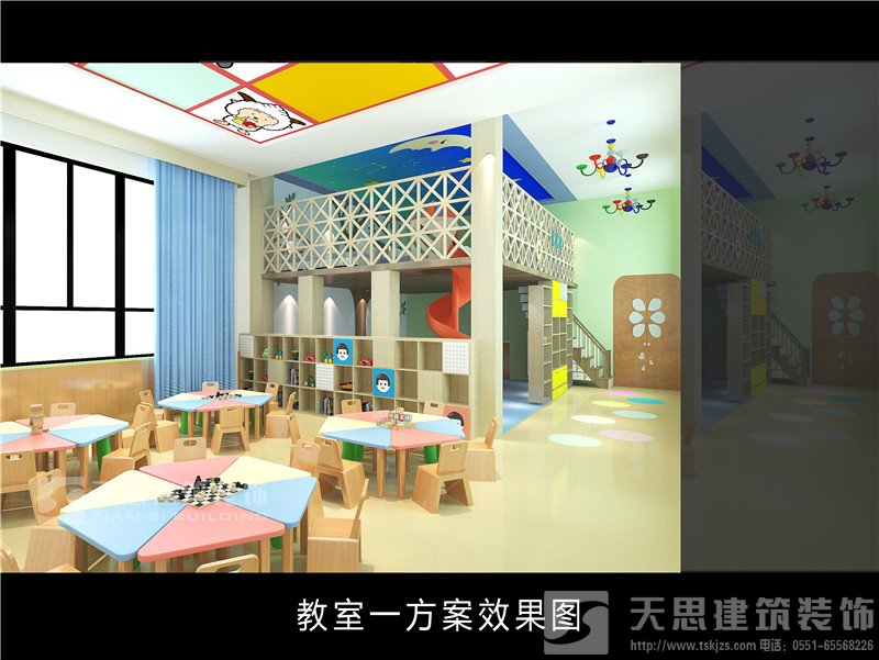 幼兒園裝修要充分考慮色彩搭配的和諧,體現(xiàn)高雅、理性與幼兒天性相融合的色彩理念。在裝修中盡量保留建筑原有的白墻面,主要家具也以較多白色塊面來協(xié)調(diào)艷麗色塊,造成亮麗、活潑、雅致的色彩效果。