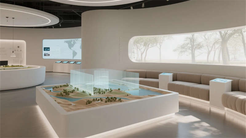 這座展廳以現(xiàn)代簡約風(fēng)格為核心,打造流暢而富有張力的空間體驗。入口區(qū)以開放姿態(tài)迎接參觀者,核心展示區(qū)陳列創(chuàng)新展品,互動區(qū)通過科技裝置激發(fā)探索樂趣。多媒體區(qū)以視聽盛宴強(qiáng)化敘事,休息區(qū)則提供舒適角落促進(jìn)交流,會議區(qū)靈活多變適應(yīng)多樣需求。主題區(qū)巧妙融入本土特色,未來區(qū)以先鋒設(shè)計點燃靈感火花。整體設(shè)計中,簡潔線條與中性色調(diào)營造寧靜基調(diào),高科技元素如數(shù)字屏和智能照明無縫融入,增強(qiáng)功能性與藝術(shù)感??臻g動線自然引導(dǎo),從喧囂到沉思,材質(zhì)選用環(huán)保而溫暖,綠植點綴平衡科技冷峻。展廳不僅服務(wù)于展示,更成為啟發(fā)對話與思考的場所,每一功能區(qū)銜接緊密,共同編織一場關(guān)于未來的故事。在合肥這座活力之城,設(shè)計以包容姿態(tài)回應(yīng)城市脈動,為公眾帶來沉浸式文化之旅。